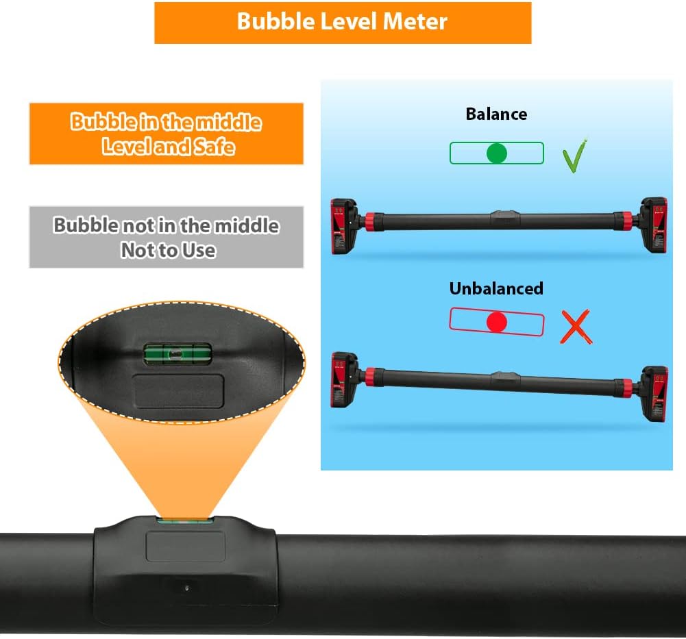 • BUBBLE LEVEL METER: Equipped with level meter, through the middle position of the bubble to judge that the pull up bar is in a level state or not. (Note: The correct installation method is that the arrow of the lever points upwards and the horizontal liquid bubble is balanced).